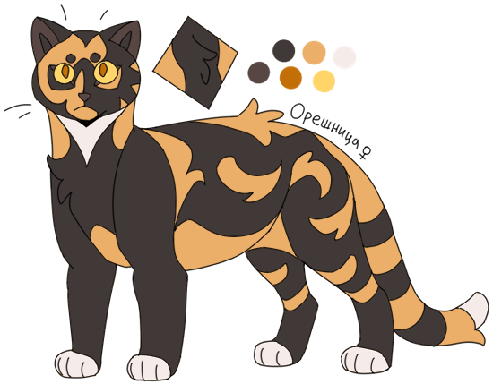 Пёстрая черно-рыжая кошка с желтыми глазами. Высокомерная и ревнивая, она не подпускает к своей семье любые угрозы. Ведомая чувствами, порой остра на язык. Орешница проста, она не обманет и не будет строить козни за спиной, смело высказывая всё своё недовольство в морду обидчика.